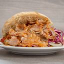 Turkish bread, chicken, dressing, white and red cabbage, iceberg lettuce