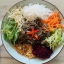 Roast beef with rice noodles, fresh herbs, lettuce, vegetables, roasted sesame seeds and peanuts + drink of your choice