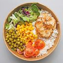 variace listových salátu promíchané v olivovém oleji, jasmínová rýže, cherry rajčátka 4ks, kukuřice, hrášek, přírodní grilovaná prsa nakrájená na plátky
