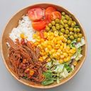 variace listových salátu promíchané v olivovém oleji, jasmínová rýže, cherry rajčátka 4ks, kukuřice, hrášek, trhané hovězí s kukuřicí a fazolemi
