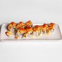 kreveta v tempuře, úhoř, avokádo, krabí krém, okurka, lehce pikantní tatarák z lososa, mayo, kaviár,