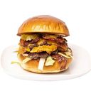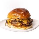 Dvě smashované placky hovězího masa od Amasa prokládané čedarem, zapečené v náloži cibule, banger mayo v podmáslové briošce 1. Obiloviny obsahující lepek; 1a. pšenice; 1b. žito; 1c. ječmen; 1d. oves; 1e. špalda; lf. kamut; 3. Vejce; 7. Mléko; 10. Hořčice