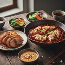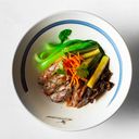 Mleté vepřové, kuřecí vývar, sezónní zelenina, červené chilli a hořčičný list chongqing