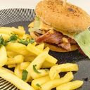 Hovězí rib-eye steak restovaný na cibulce, s žampiony, rozpeklým americkým sýrem a omáčkou dle výběru,v rozpečené bagetě.