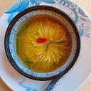 Jemné tofu vařené se skleněnými nudlemi, houbami, sezónní zeleninou ve vývaru 6. Sójové boby; 10. Hořčice; 1. Obiloviny obsahující lepek; 1a. pšenice; 1b. žito; 1c. ječmen; 1d. oves; 1e. špalda; lf. kamut