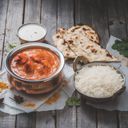 Kousky kuřete pečené v peci podávané v krémové máslové rajčatové omáčce. Rýže nebo naan