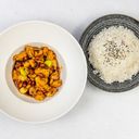 Kuřecí maso, jarní cibulka, arašídy, sečuánský pepř, chilli pasta, sójová omáčka. Rýže.