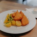 Kuřecí a vepřové maso obalené v trojobalu, podávané s beraními rohy, okurkou, citronem a chlebem. (500 g)