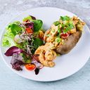 pečená brambora plněná lososem, cuketou, lilkem, rajčaty a medovo-hořčičným dressingem