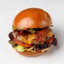 hovězí maso, karamelizovaná cibulka, sýr čedar, grilovaná slanina, kyselá okurka, rajče, dubový salát, česneková majonéza