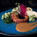 bramborové pyré, špenátové listy, máslová omáčka, fava fazolky