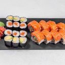 california sezam 8ks (losos,okurka,japonská majonéza,avokádo,sezam), sake maki 6ks (losos), teka maki 6ks (tunak), sake nigiri 2ks (losos), maguro nigiri 2ks (tunak)