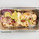 Kousky domácího smetanového sýra marinované v jogurtu a chilli, pečené v peci Tandúr a servírované s čatní a plátkem citrónu.