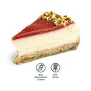 100 g - Low Carb cheesecake. Ořechový korpus, tvaroh (anglicky cheese) a jahodová poleva. Posypán pistáciemi.