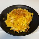 Široké nudle, kuřecí maso, mrkev, vejce, zelí, cibule, pórek, sójové klíčky