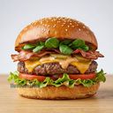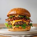 2x75g hovězího masa, cheddar, polníček, rajče, nakládačka, salát a M&K bacon