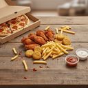Pizza + Wings(12) + Nuggets(12) + Strips(6) + Double Fries + 5 Sauces