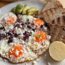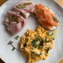 Kváskový chléb s lučinou, uzeným lososem a citronovou kůrou Kváskový chléb s máslem, šunkou od kosti, cornichons a hořčičným semínkem Míchaná vajíčka na másle s cibulkou a microgreens