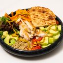 zdravá směs zeleniny, quinoa, restovaná cizrna, grilované kuřecí prso a citronové tahini