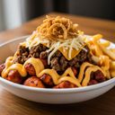 Mleté hovězí, hovězí slanina, salami, hranolky uvnitř, rozpuštěný čedar, karamelizovaná cibulka, alžírská omáčka a zapečená tortilla