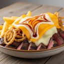 Hovězí maso, smažená cibule, sýr čedar, mozzarella, omáčka dle výběru, hranolky a sýrová omáčka