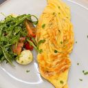 0Vaječná omeleta se šunkou, Rukolový salátek s mozzarellou, cherry rajčaty a pestem, pečivo