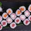 uvnitř: avokádo, okurka, krabí tyčinky. vně: losos, tuňák, wakame.