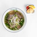 Tradiční Phở bò tái polévka: restovaná hovězí kýta, pikantní zázvor, svěží koriandr & mix jarní/červené cibule.
