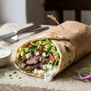 Kuřecí maso, tzatziki, balkánský sýr, rajčata, červená cibule, hranolky, čerstvý salát