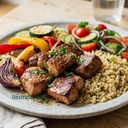 Kuřecí maso, pikantní bylinková omáčka, rajčata, červená cibule, pečená zelenina, červené zelí