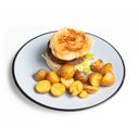 Hovězí Prime burger: stařené hovězí maso, cibulové čatní, plátek čedaru, zeleninové julienne, salát, majonéza, pšeničná bulka, smažené pečené grenaille (malé kulaté brambůrky)
