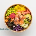 Rýže, Japonská majonéza, mix salátů, jarní cibulka, avokádo, okurky, wakame, edemame, smažená cibule, sezam a losos.