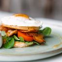 slaná varianta domácích lívanců se uzeným lososem, smaženým vejcem, rajčaty, polníčkem a javorovým sirupem strane