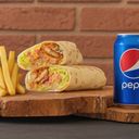 Kuřecí gyros,hranolky,ledový salát,rajče,červená cibule,česneková majonéza.