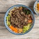 Rýžové nudle s restovaným hovězím masem, bylinkami, arašídy, omáčkou
