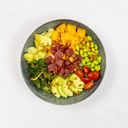 Tuňák v sashimi kvalitě, wakame, sushi rýže, originální Hawai omáčka, edemame, avokádo, smážená cibule, mango, sezam, okurka, řepa, japonská majonéza