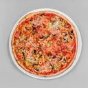 tomat, sýr, šunka, chorizo salám, anglická slanina, salám, niva, oregáno
