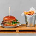 250g Hovězí maso, dresing, slanina, cibulka, mix salátů, rajče, okurek, cheddar, jalapeňo papričky, belgické hranolky se slupkou, BBQ dip